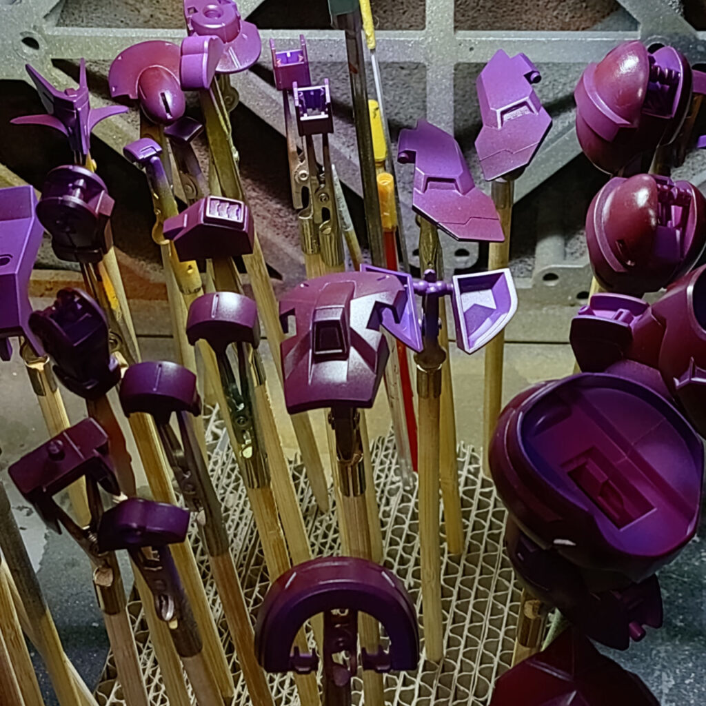 タミヤのアクリル塗料ミニのパープルを塗ったら、ドムみたいな色になったので、さらにクリヤーレッドを重ね塗り。だいぶ暗い色になっちゃったな。